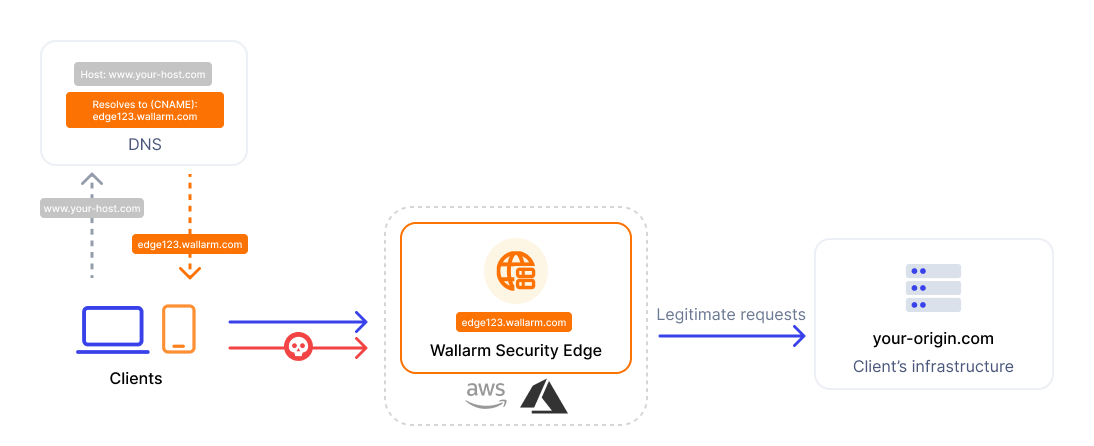 DNS-based traffic redirection: you configure your DNS to point your API domains to Wallarm Edge Node.