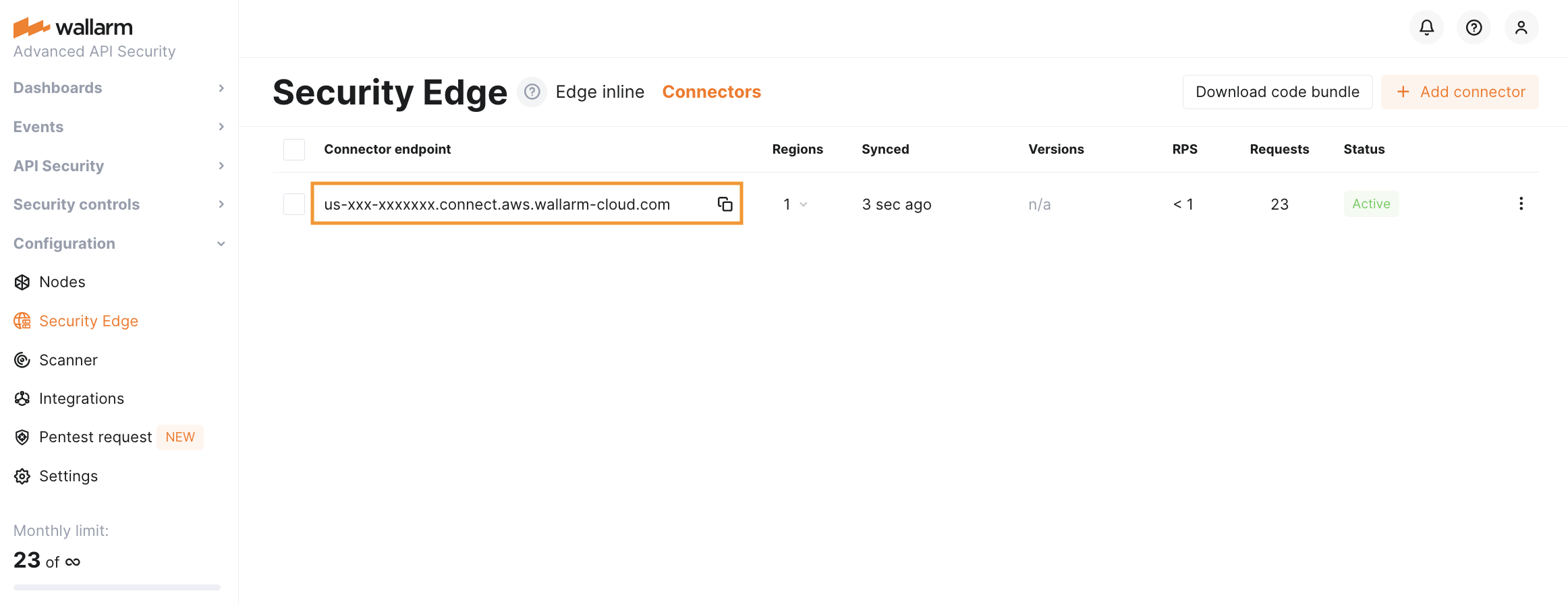 To run the Security Edge Connector, go to the Wallarm Console → Security Edge → Connectors → Add connector. If this section is unavailable, contact sales@wallarm.com to access the required subscription.